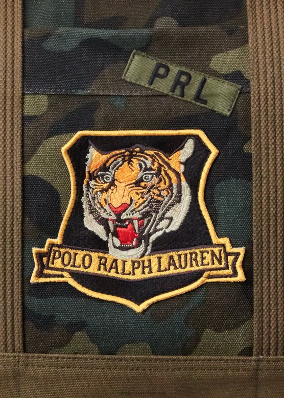 <п><п>ова издржљива платнена торба има маскирни принт и еклектичну мешавину закрпа, укључујући ричућег тигра са потписом поло.<п>п>