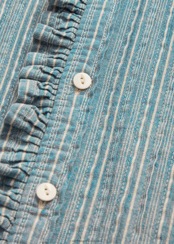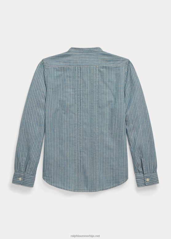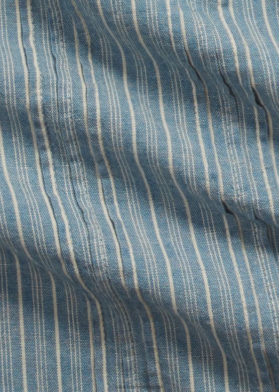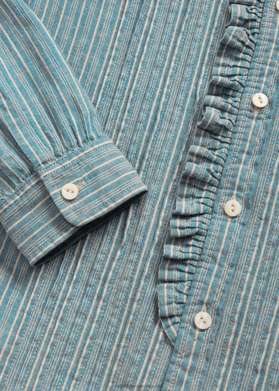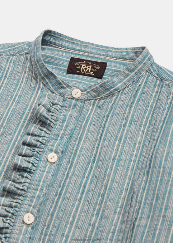 <п><п>направљена од лагане тканине ткане у Јапану од предива од памука, лана и рамије. обојен правим индигом. инспирисан блузом с почетка 20. века. пругасти узорак инспирисан старином. дизајнирана са огрлицом са траком, набораним обрубом на преклопу и ушивањем на предњој страни. опран за изглед и осећај дуготрајног. дугмад за речне шкољке.<п>п>