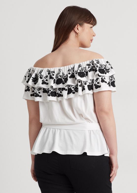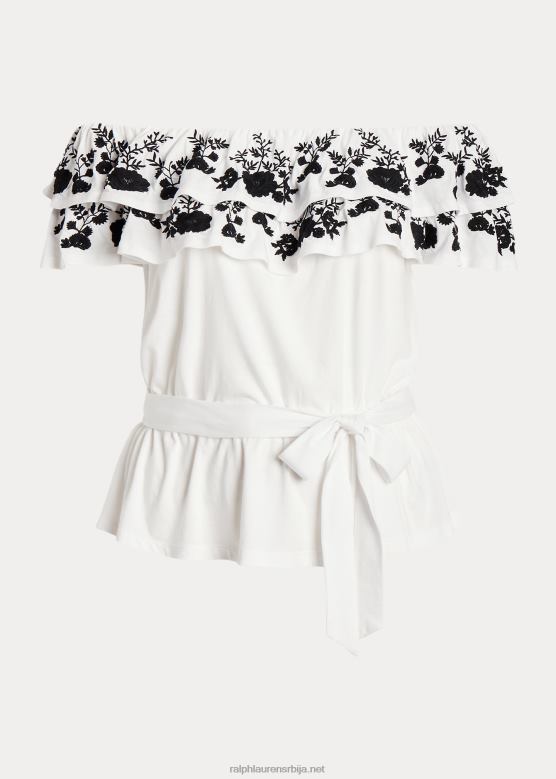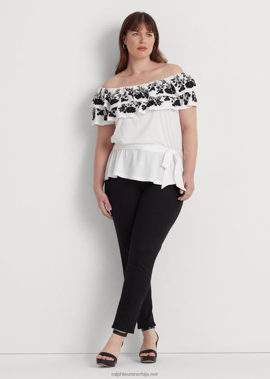<п><п>Израђен у лаганом дресу од мешавине памука, овај топ од пеплум-а карактерише силуета отворених рамена и каиш без напора. шумећи волани и елегантни цветни вез наглашавају његову женственост.<п>п>