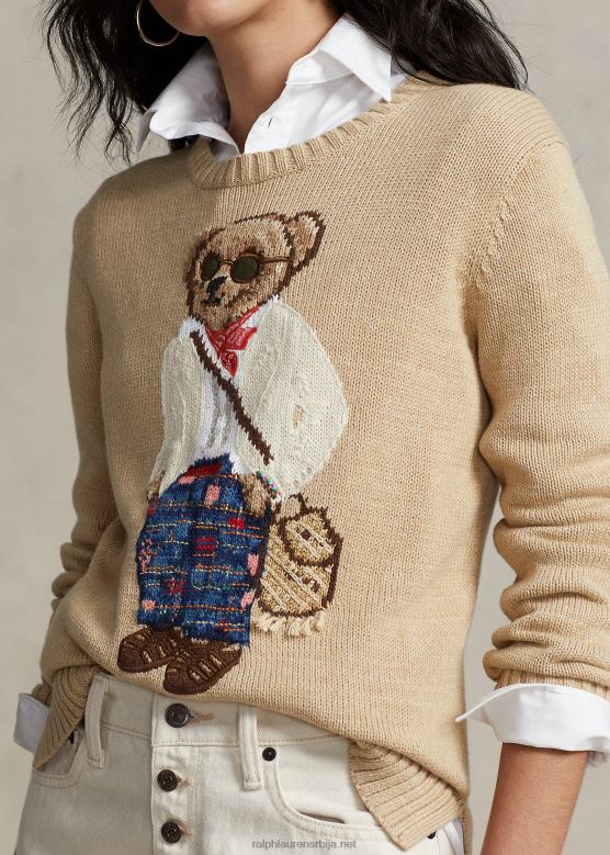 <п><п>овај мекани џемпер са округлим изрезом има плетену интарзију и извезену слику нашег легендарног поло медведа, стилски обученог са марамом, мадрас панталонама и торбом са ресама.<п>п>