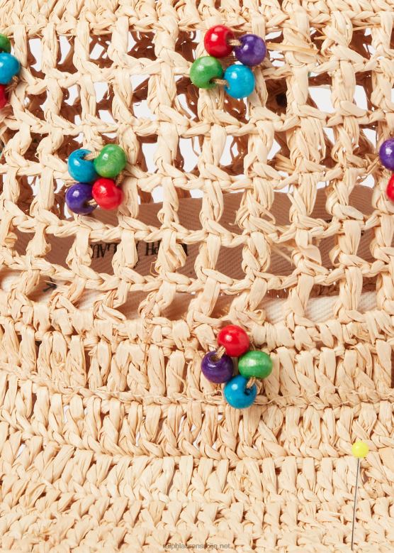 <п><п>Занатски изглед силуете кофе, овај шешир од рафије је хеклан ажурним шавовима на круни и детаљан шареним дрвеним перлама.<п>п>