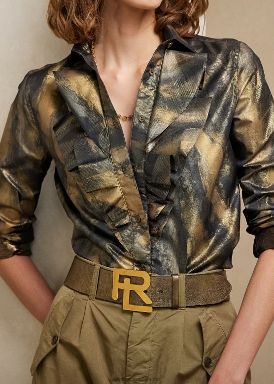 <п><п>иконична силуета колекције, кеара уздиже ванвременску кошуљу са слојевитим каскадним воланима на ретку. Наглашена правим седефастим дугмадима, овосезонска изведба је направљена са нашом модерном интерпретацијом текстура исплетених у корпама са експресивним отвореним шавовима и златно-брнзаним концем који привлачи светлост. показујући посвећеност Ралфа Лорена финој италијанској изради, ова кошуља је ручно осликана апстрактном металик маскирном техником за луксузни сензибилитет.<п>