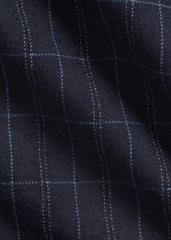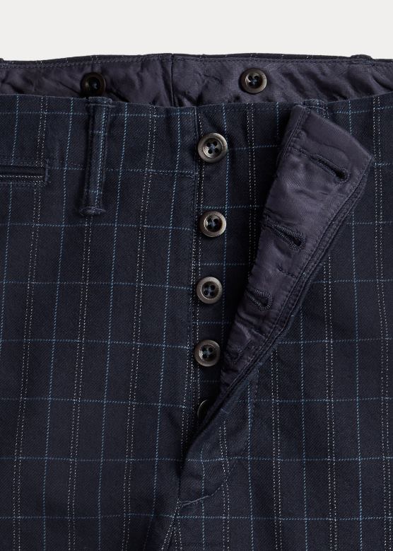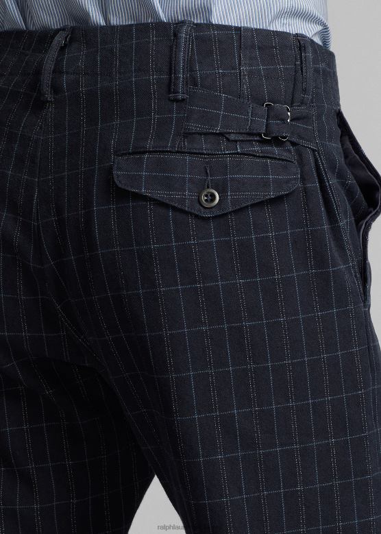 <п><п>укројене панталоне са равним ногавицама. направљен од карираног памучног и ланеног кепера који је ткан у Јапану и обојен индигом. бочни подешавачи. корозо дугмад.<п>п>