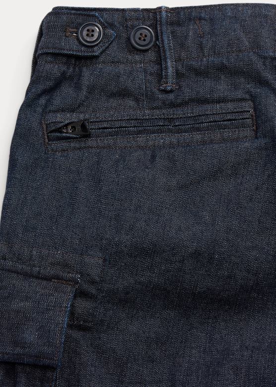 <п><п>уске карго панталоне направљене од 10 оз. јапански растезљиви деним. џепови за терет на бутинама и коленима. зглобна колена за лакше кретање. зип манжетне.<п>п>