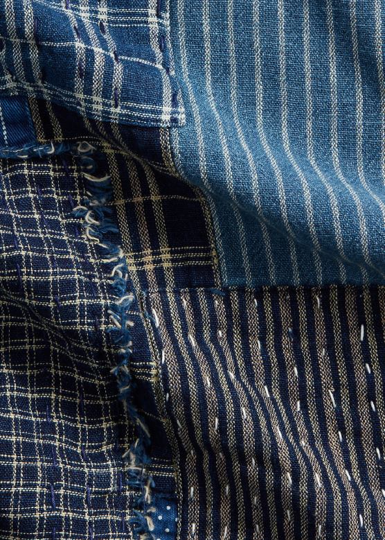 <п><п>патцхворк дизајн састављен од индиго обојених тканина за кошуље. инспирисан јапанском боро тканином и техникама ручног шивања сашико. подлога од индиго памука. опрана и тонирана.<п>п>
