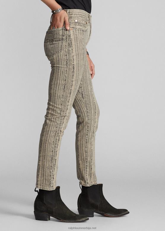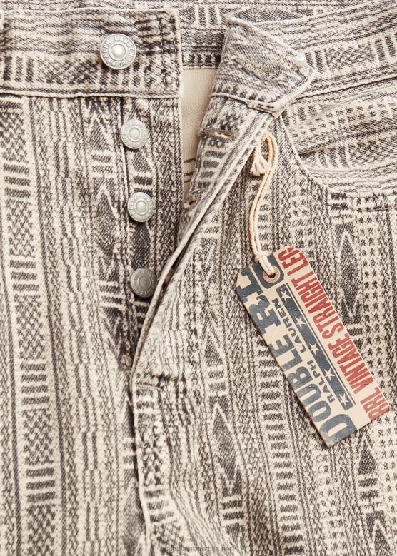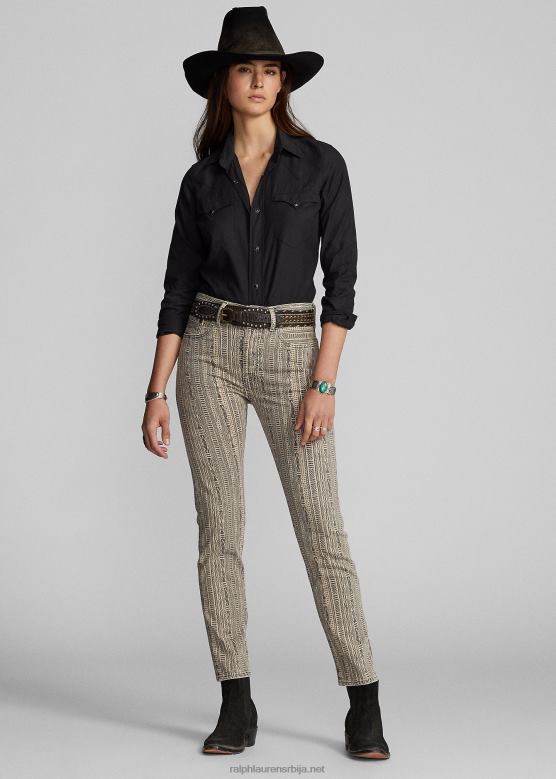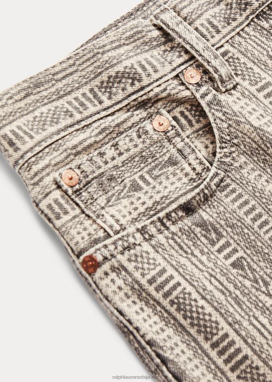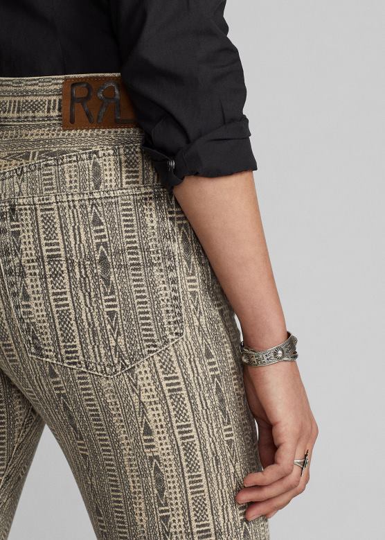 <п><п>Јеанс равног кроја направљен од природног памучног еластичног тексаса. штампан мотивом инспирисаним југозападним тканим дизајном. шлиц на дугмиће. ''ррл'' вез на џепу за новчић.<п>п>