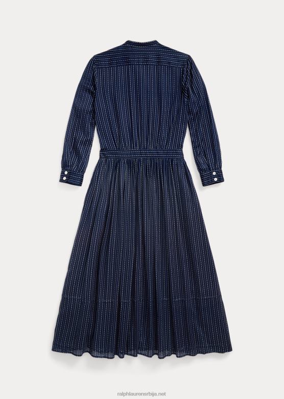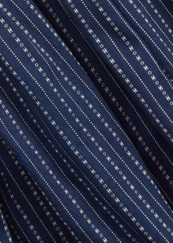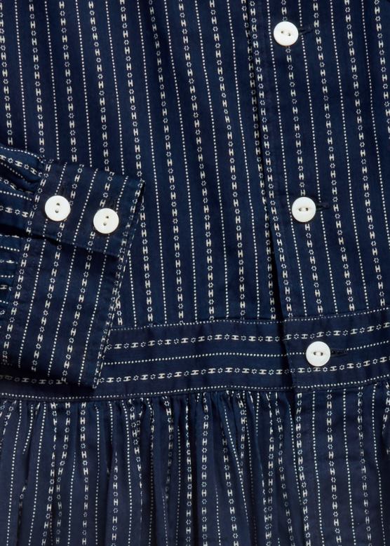 <п><п>хаљина са кошуљом од лаганог памучног воала. обојен правим индигом и одштампан мотивом тачкастих пруга инспирисаним старином. детаљи инспирисани радном одећом с почетка 20. века. завршено дугмадима од речних шкољки.<п>п>