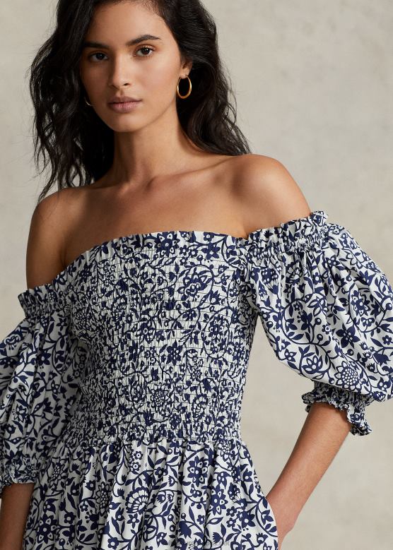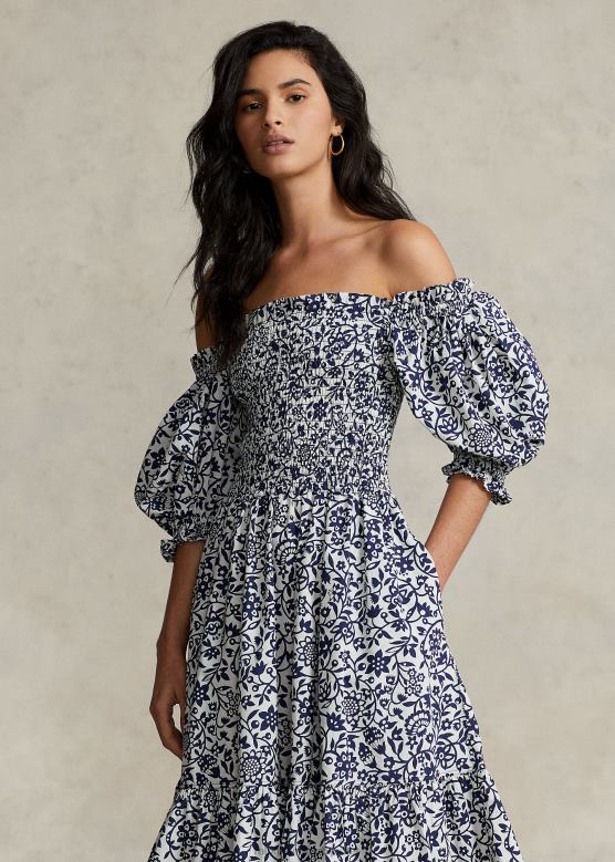 <п><п>Каналиши дух путовања, ова хаљина са отвореним раменима израђена је од прозрачног памука са двобојним цветним мотивом. ушушкани стезник и шиљасти слој побољшавају силуету која се уклапа и лепи, док кратки блусон рукави додају волумен.<п>п>