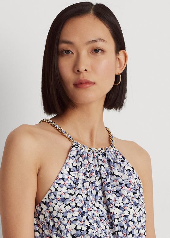 <п><п>Израђена у растезљивом дресу за мекану руку и лакоћу кретања, ова шармантна хаљина са цветом је дефинисана силуетом халтера који открива рамена са блиставим ланчаним каишевима. еластични струк ствара ефекат блузона, док самопојас нуди завршницу без напора.<п>п>
