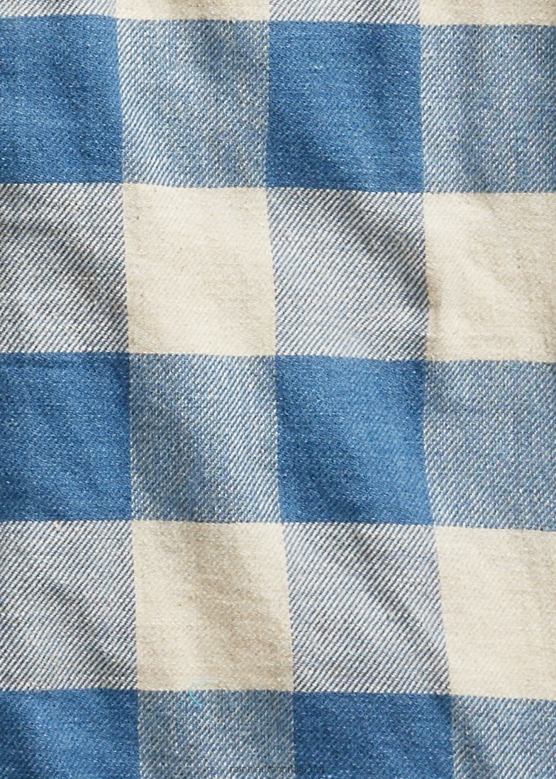 <п><п>уска кошуља кројена од лаганог кепера од памука и лана. индиго обојени карирани узорак. метално дугме на крагни.<п>п>