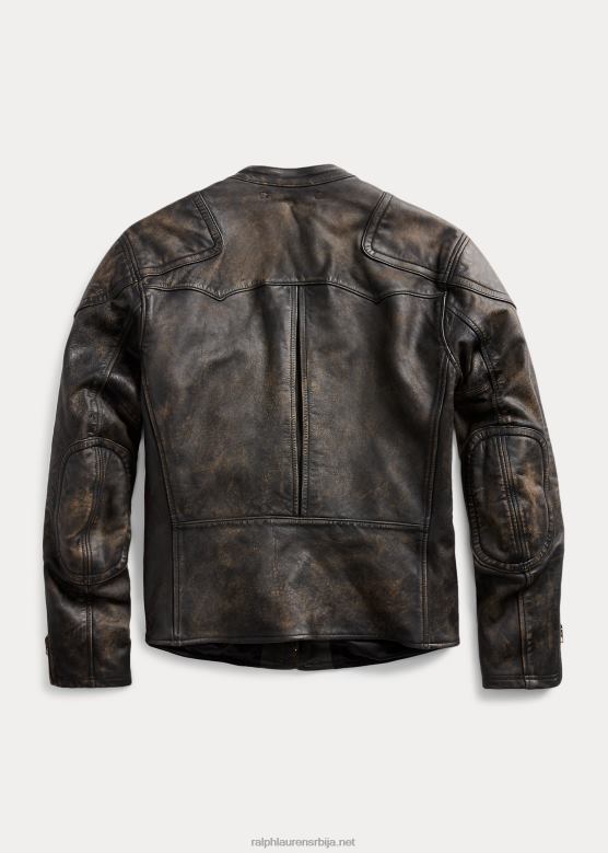 <п><п>инспирисан мотоциклистичком јакном из касних 1940-их од мр. Лоренина лична колекција. направљен од биљно штављене говеђе коже са црно-смеђом нијансом. узнемирени завршетак постигнут кроз процес у више корака који омогућава комаду да настави да стари са хабањем. подстављене закрпе за рамена и лактове. кафе тркачка огрлица са постољем. потпуно обложена кепером.<п>п>