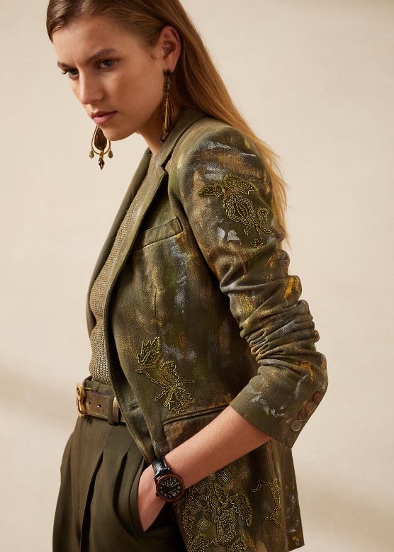 <п><п>Уметничка интерпретација маскирне штампе, овосезонска изведба калан блејзера је изведена у памучном тексасу који пролази кроз вишестепени занатски процес. прво, јакна је обојена у маслинасто зелену боју са потписом сезоне. затим, сребрни и златни потези четкице су ручно осликани преко његове силуете са једним дугметом. на крају, колекција ручно испреплетених цветних закрпа је ручно аплицирана, чинећи овај безвременски блејзер јединственим комадом.<п>п>